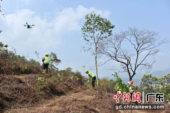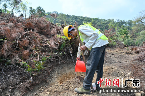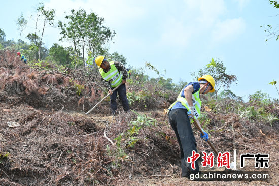 3月25日,广东西江流域国土绿化示范项目开工暨春季造林活动在广东省肇庆市举办。据介绍,该项目是广东省纵深推进绿美广东生态建设的一个重大工程,总投资13.17亿元,项目覆盖林地62万亩,建成后将形成136个千亩以上连片优质森林大斑块。图为工作人员在广东省羚羊峡古栈道森林公园造林点开展植树活动。
